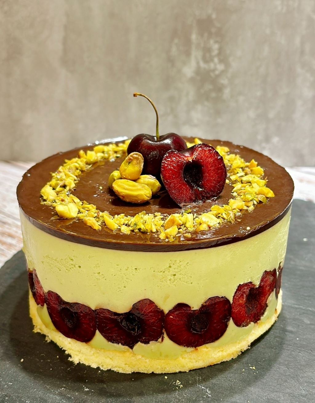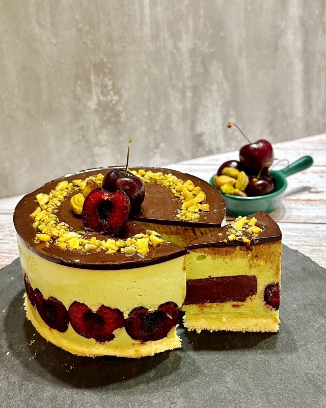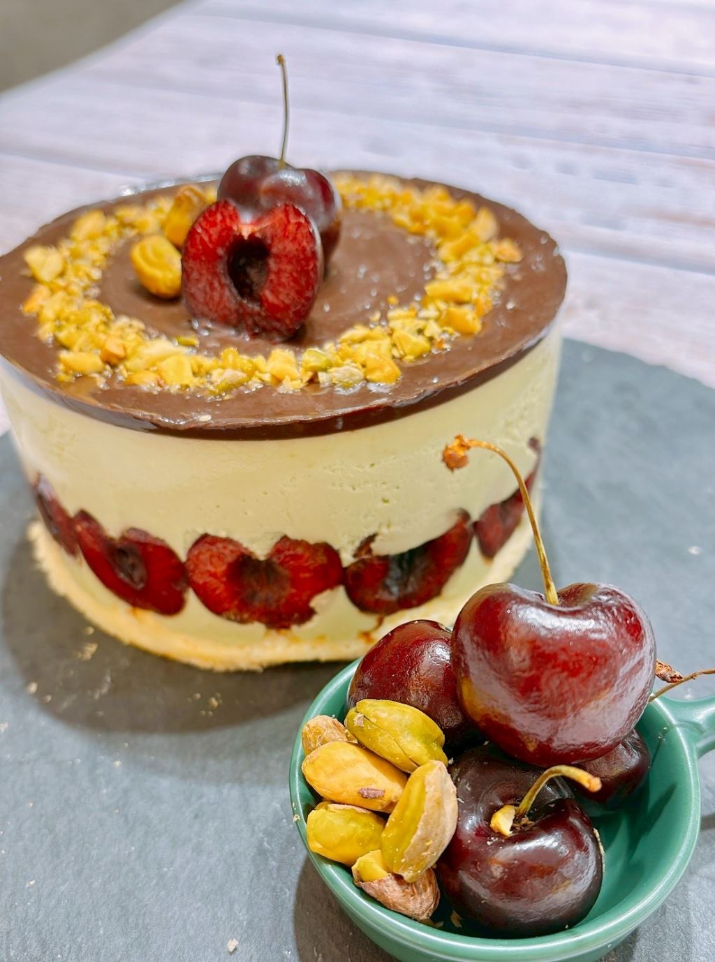 開心果醬,開心果本果,奶油乳酪,白巧克力,動物鮮奶油,吉利丁片,手指餅乾,瑪雅娜巧克力,黑醋栗酒,糖,新鮮櫻桃等。
